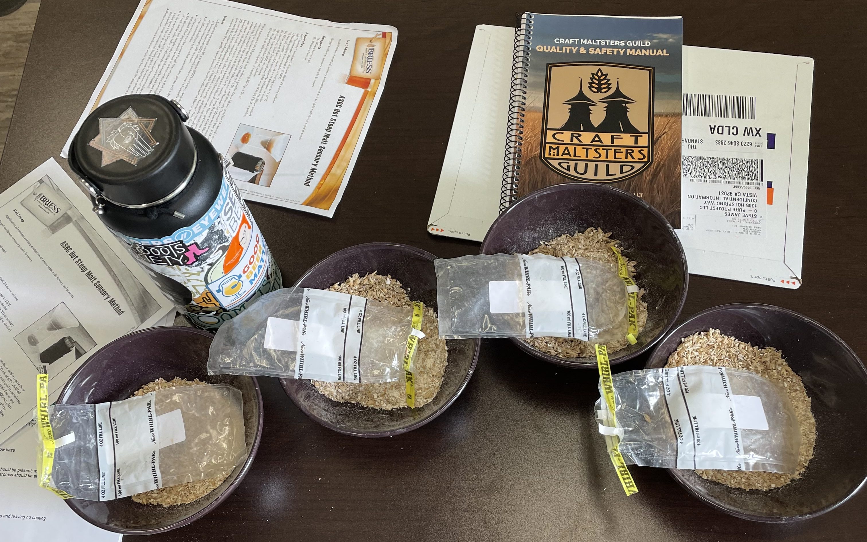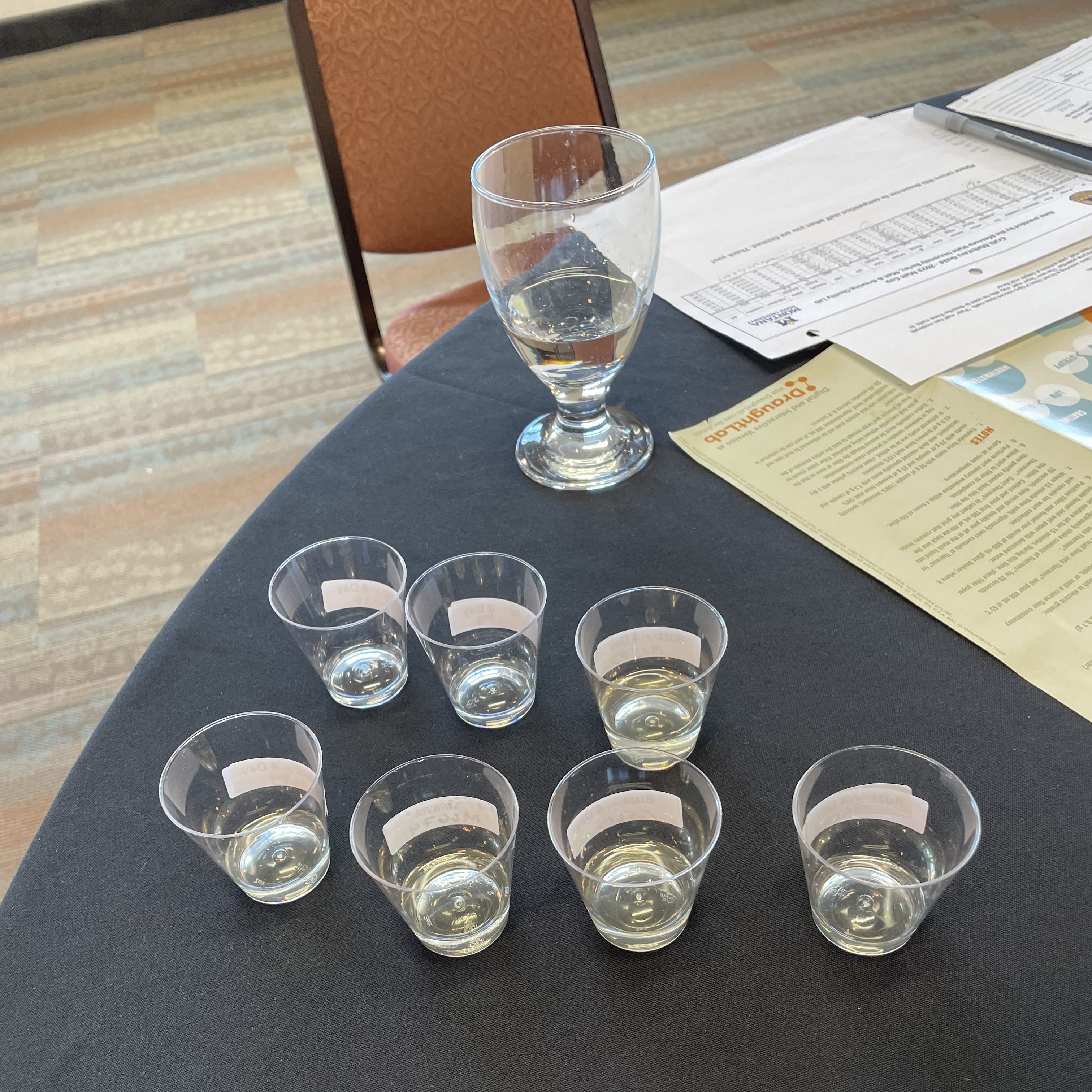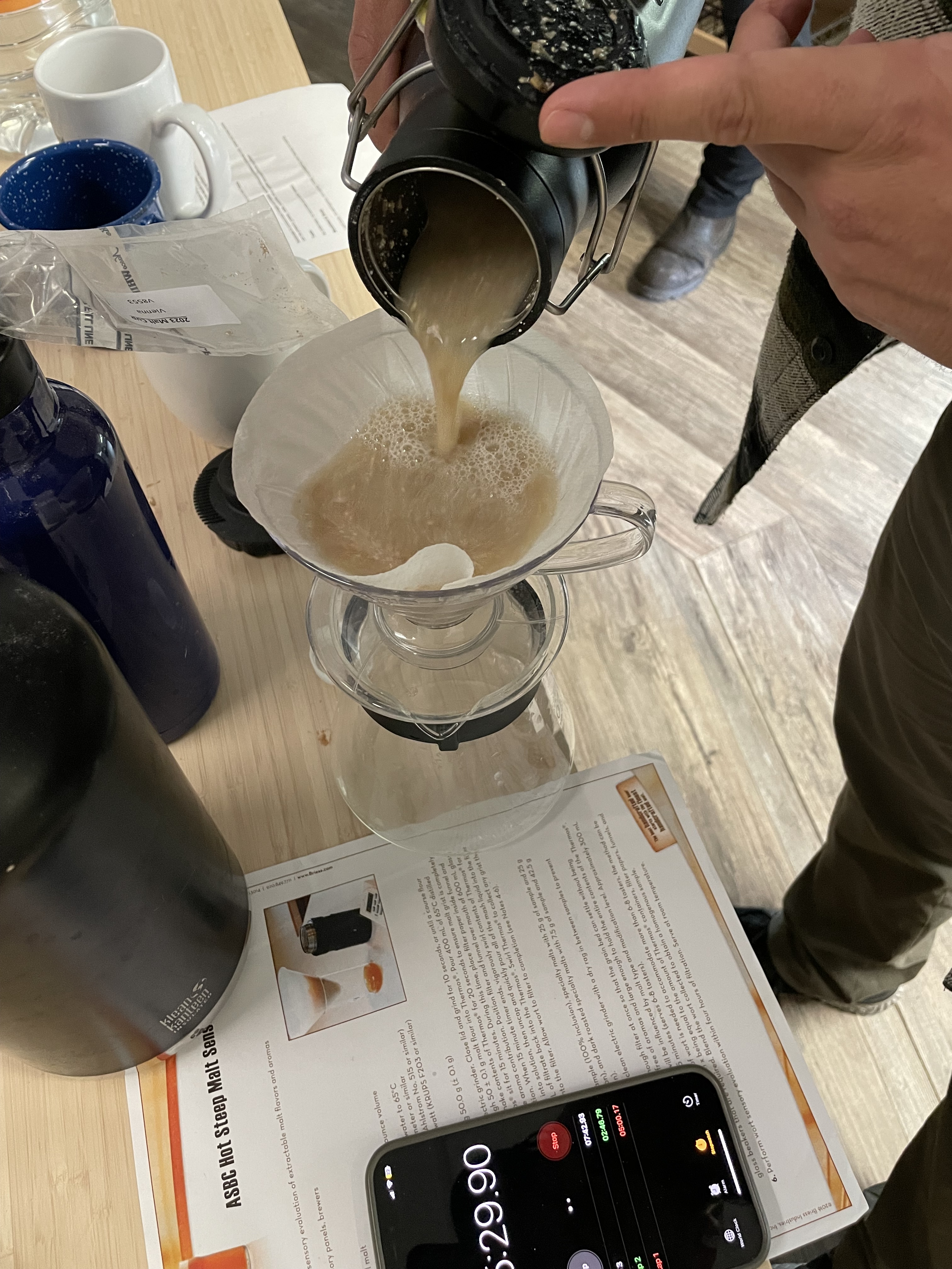 For the Best of Show (BOS) I judged with Jeff Bloem of Murphy & Rude Malting Co. and Jeff Malkiewicz of Great Lakes Malting Co., two highly experienced maltsters. We judged one malt category, and the other three categories were judged by three teams of 11 judges total. We evaluated both the COAs and sensory feedback using paper forms. During the event, Hannah, Lindsay, and their team did the hot steeps for BOS (which is a lot of work). When judging like this, you write down your initial impressions first, then keep going back to the wort (or beer, mead, cider, wine, spirit, etc.) and gather more impressions. Aromas change as the liquid changes temperature, and certain flavors can overshadow more subtle flavors until you can look past them, so many many tiny sips and sniffs are needed to build a full picture of the liquid. You do this yourself in silence, and once everyone’s done completing their scoresheets you discuss as a group your impressions. Since sensory is highly personalized, folks can have physiological deficits or blind spots, or they can be super sensitive to certain chemicals that others may not be aware of. Once we winnowed down who our personal top three were, we ‘negotiated” a bit on the placement. Getting fresh samples of the worts and comparing them again brought out new impressions. In the end, we agreed on the first, second, and third place winners, and the Jeffs and I were excited by the winning malts and were eager to find out who made them.