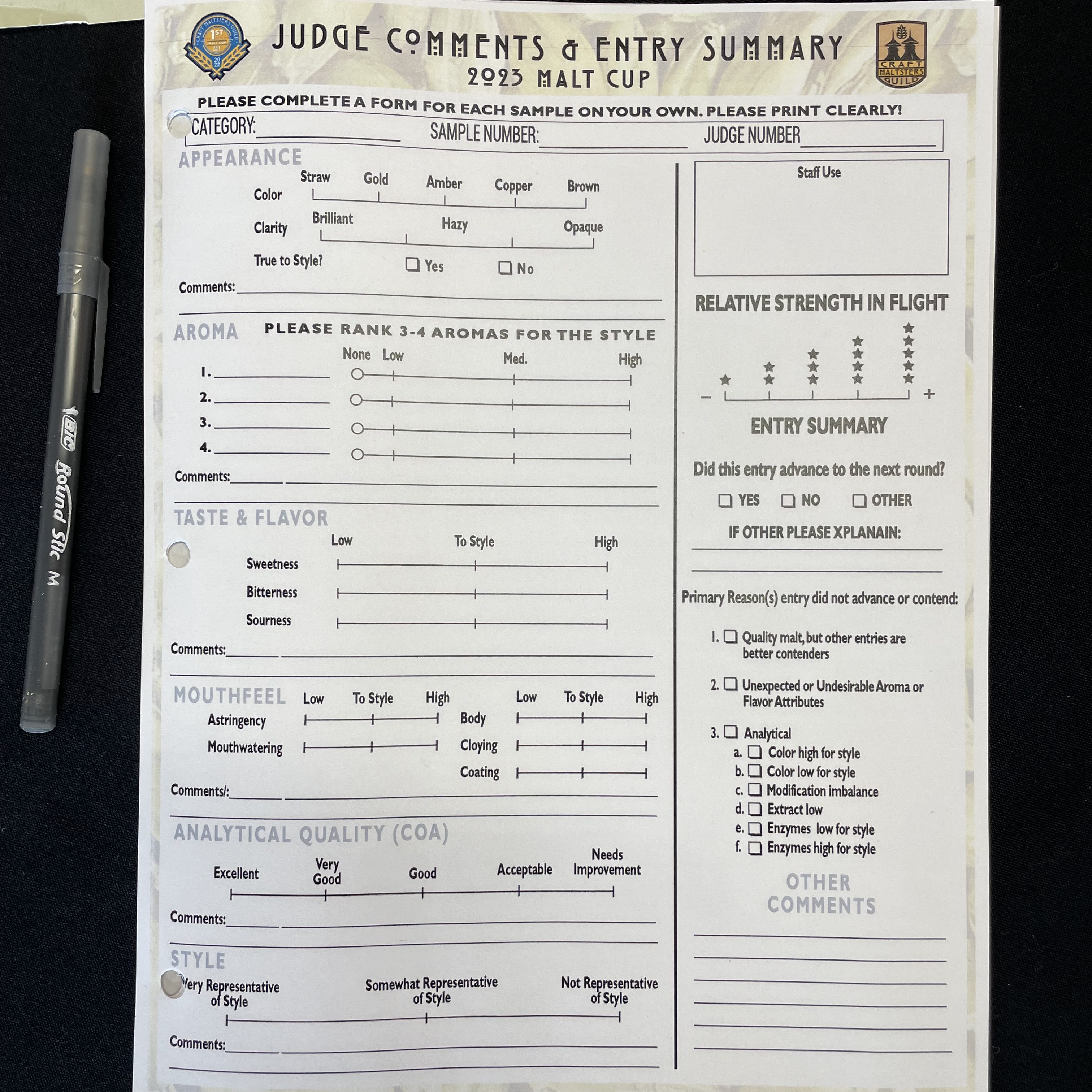 I judged the second sensory round in December 2022 with Chris Leguizamon and Winslow Sawyer at Pure Project in San Diego. We were one of 32 teams who judged the second round remotely. We did not have access to the COAs, but we did have samples of four malts of the same category. We used the American Society of Brewing Chemists (ASBC) Hot Steep Malt Sensory Evaluation Method for sensory analysis and DraughtLab’s Sample Ox app. We used the malt category specs to judge each malt on the overall, hedonic impression (how “good” the malt is based on our sensory impressions and category description). This scale was not now much we “liked” the malt, but how close it aligns to the overall impression from the description (if you do BJCP judging, this is similar to the Overall Impression section of the scoresheet). Then we identified the sensory attributes: Visual, Aroma & Taste, and Mouthfeel. Sample Ox is awesome because it is built on the flavor lexicon that Lindsay Barr and their team developed at DraughtLab (and that you can find on their numerous Flavor Maps). Finally, we ranked the four samples, with the number one moving on to the best of show. It was amazing how different the four samples were from one another, yet we all agreed on the winning sample being hedging out the others as the best: more well-rounded, deeper and more nuanced flavors without astringency. It was a great learning experience for all three of us. Each malt was judged twice during the second round, so in total 171 judges judged 62 malts, of which 26 malts moved on to the third round.