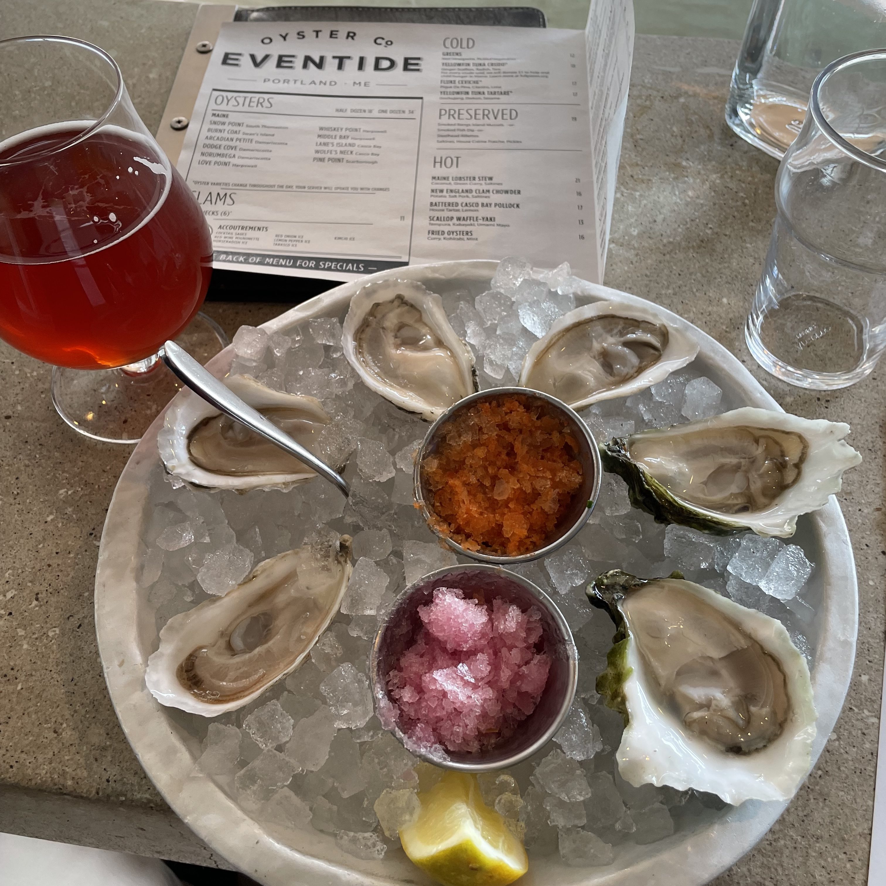 The fourth lobster roll was recommended by Carla Lauter, a great Portland-based beer writer who knows a thing or two about a thing or two. Eventide Oysters Co.‘s unique brown-butter lobster roll featuring a steamed bun (similar to bao) and lovely browned butter. Since it was an indulgent bite, I paired it with some Maine oysters and Oxbow Brewing Co. Penumbral farmhouse ale with cherries and blueberries. The oysters were incredibly fresh and flavorful, and the red wine mignonette ice was a great accoutrement that didn’t overwhelm the briny and sweet shellfish. The kimchi ice was also interesting but a touch too overpowering. Nonetheless, it was a lovely taste of Maine and I hope to bring my family here on a vacation soon.
